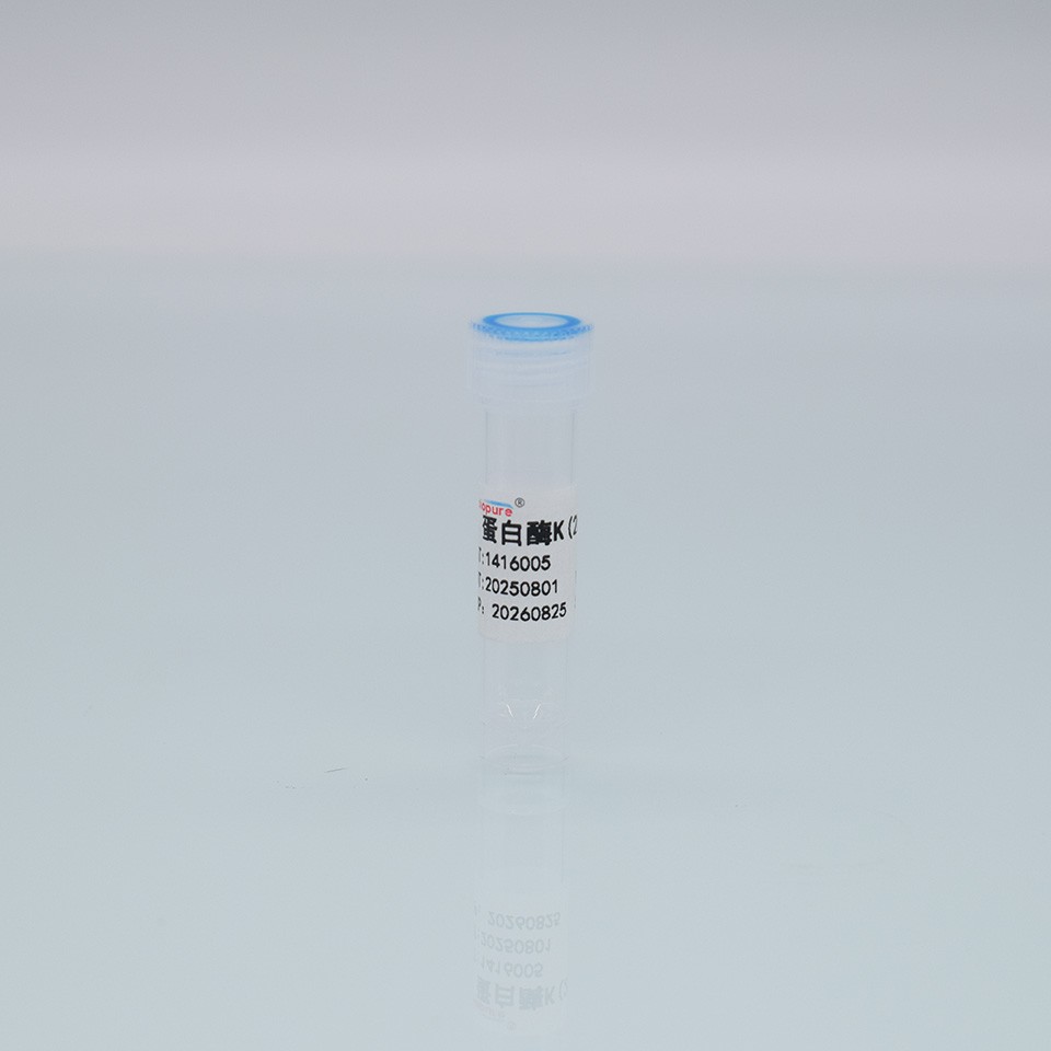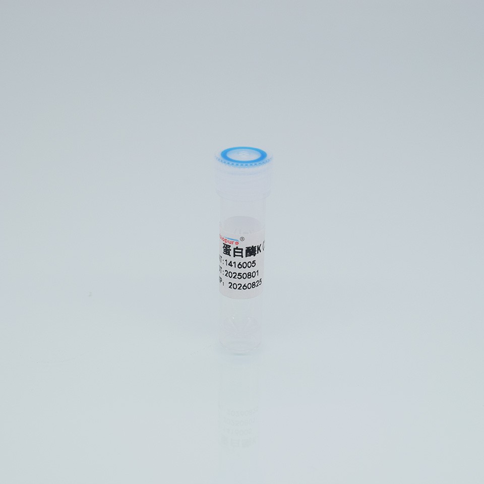 蛋白酶K(Proteinase K),相對分子量約為29.3 kDa, 是一種切割活性較廣的絲氨酸蛋白酶。可切割脂族氨基酸和芳香族氨基酸的羧基端肽鍵,應用廣泛,可用于制備脈沖電泳的染色體DNA,蛋白質印跡以及去除DNA和RNA制備中的核酸酶等實驗,蛋白酶K的一般工作濃度是50—100μg /ml。因蛋白酶K在變性劑如SDS(1%)中可提高其活性,所以在使用中,常根據所用緩沖液是否含有SDS、尿素、pH、溫度等因素確定具體的工作濃度。蛋白酶K在較廣的pH范圍內(pH 4-12.5)均有活性。